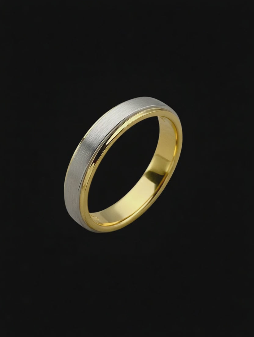 Aliança reta em ouro branco paladinado 18k e ouro amarelo 18k. Aliança com acabamento fosco acetinado na área de ouro branco. Produto feito à mão.