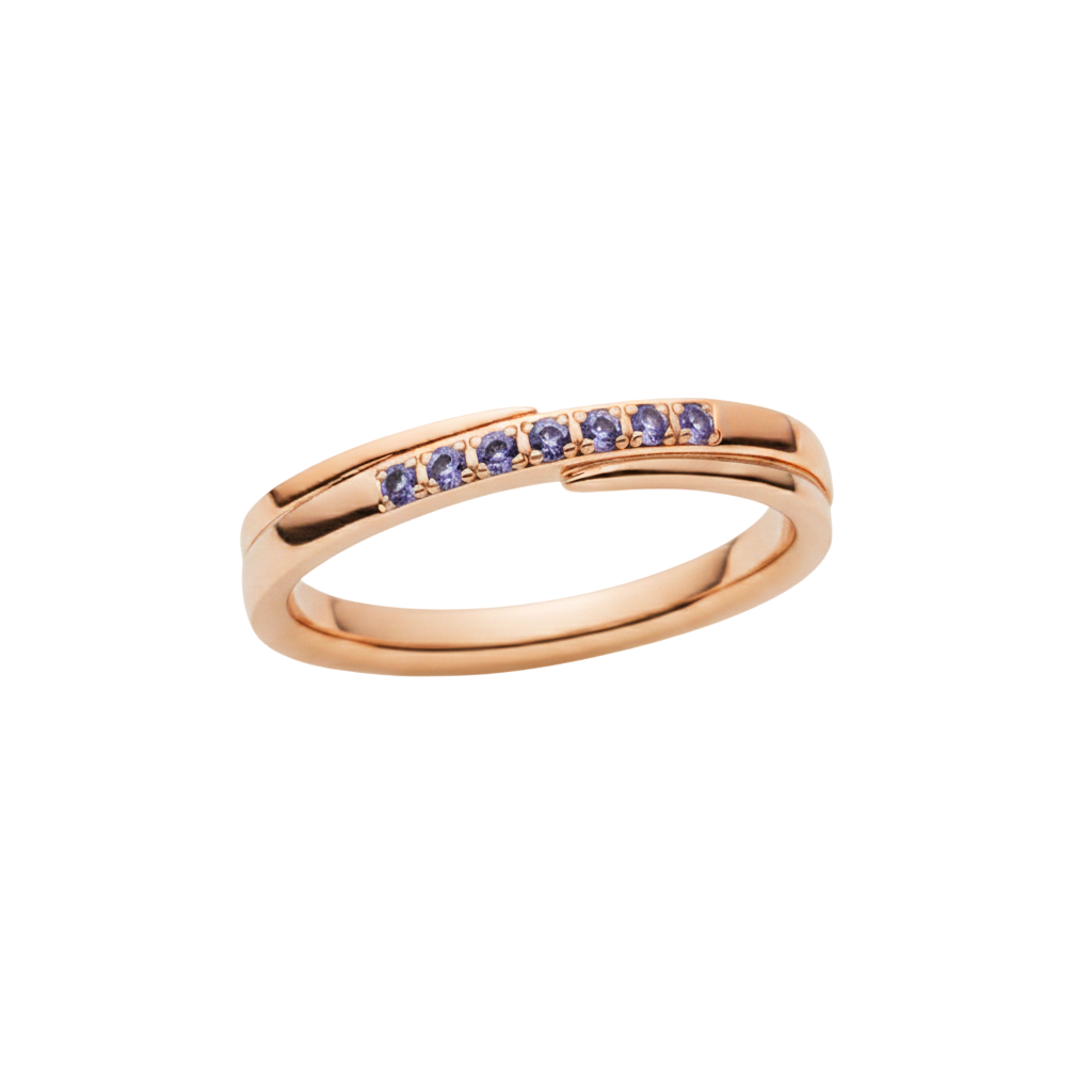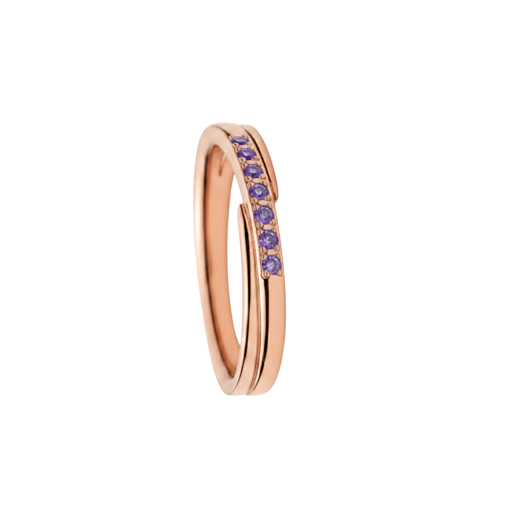 Anel em ouro rosa 18k. Design delicado em aro com sobreposição estilo espiral. Sete tanzanitas roxas selecionados são cravados na parte superior central da peça, proporcionando um brilho intenso e contínuo. Produto feito à mão.