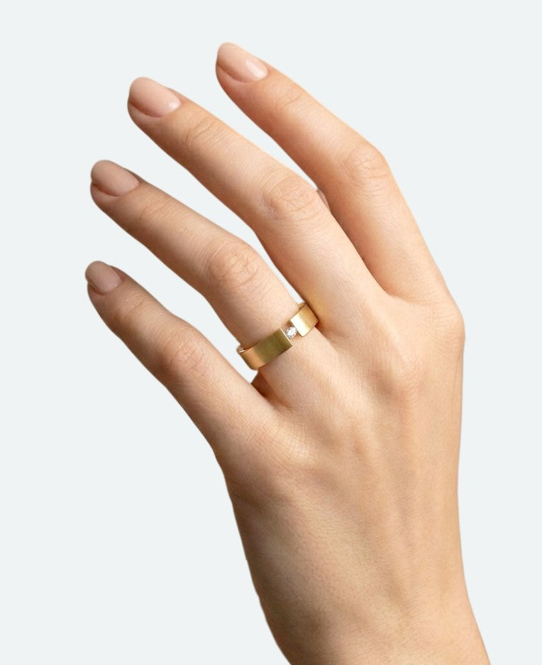 Anel de ouro amarelo 18k fosco. Modelo de anel em estrutura reta, com acabamento interno levemente anatômico. Produto feito à mão.