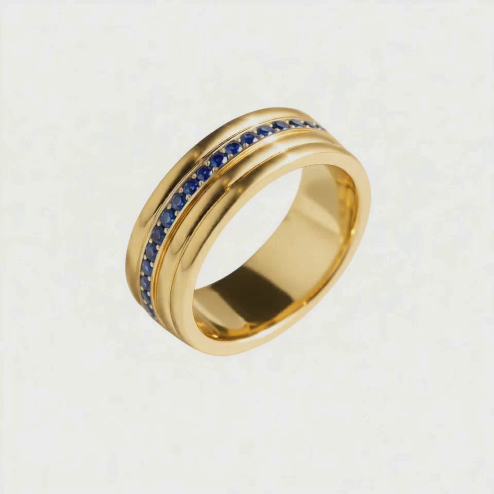 Anel largo ouro amarelo 18k. Lindo anel com detalhes em 3 frisos paralelos levemente abaulados. Estrutura com acabamento polido e safiras azuis. Produto feito à mão.