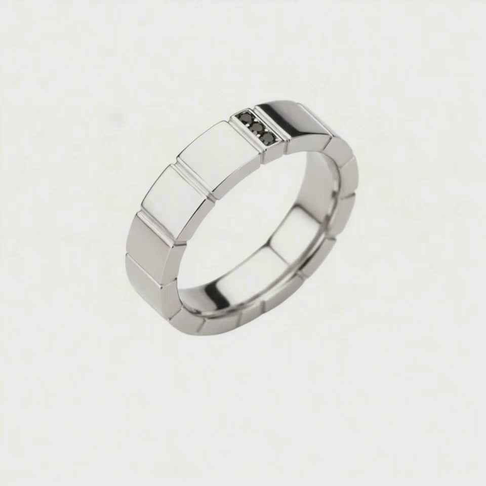 Anel masculino em ouro branco 18k. Elegante design de anel em ouro, estrutura com frisos paralelos e diamantes negros. Produto feito à mão.