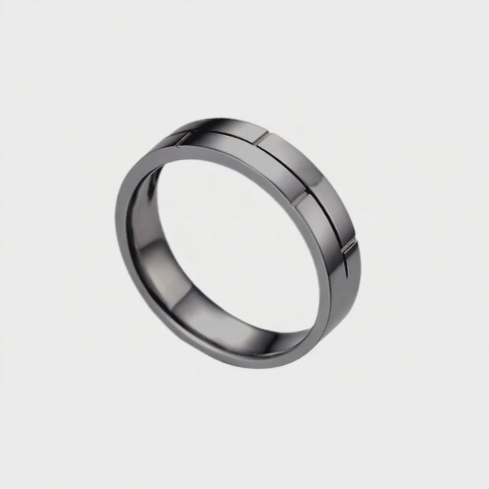 Anel masculino diferenciado, estrutura reta em ouro negro paladinado 18k. Lindo modelo de anel ouro negro com detalhes de frisos e acabamento externo polido. Produto feito à mão.