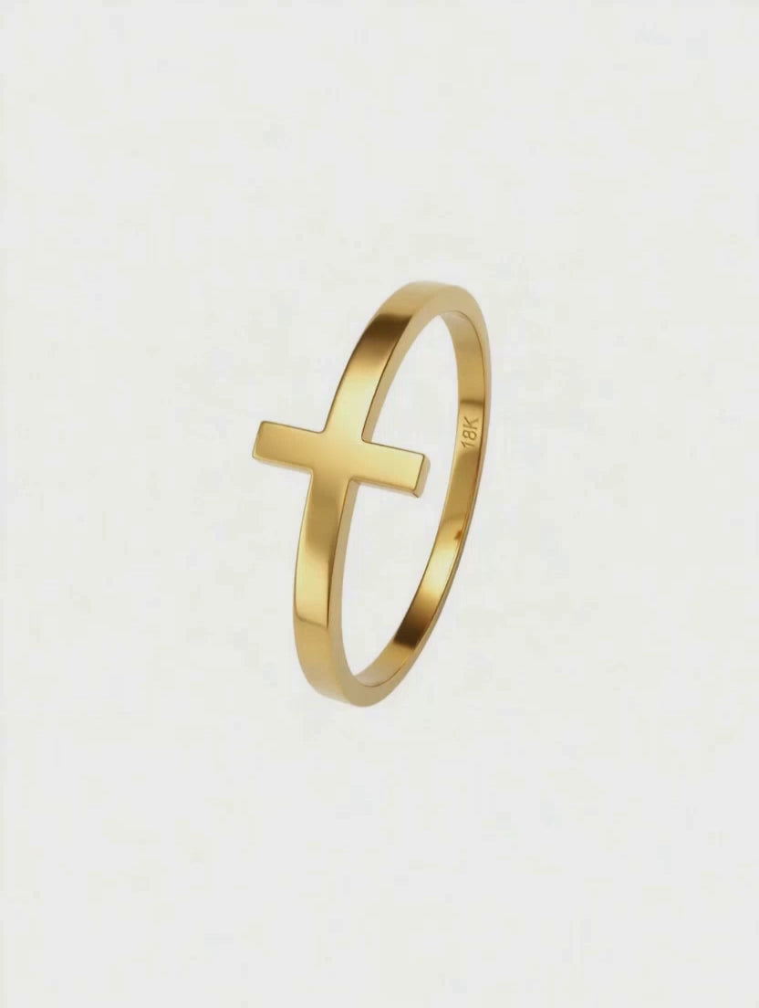 Anel cruz de ouro amarelo 18k. Anel sofisticado e moderno com motivo de crucifixo.