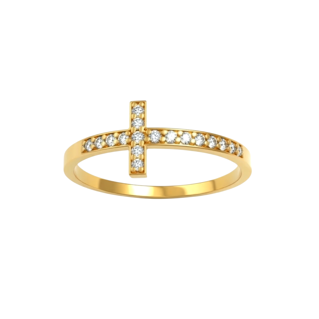 Anel cruz de ouro amarelo 18k com diamantes. Anel sofisticado e moderno com motivo de crucifixo.