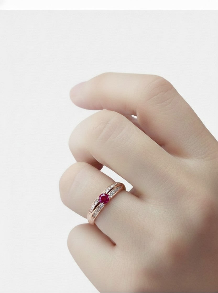 Anel solitário de rubi e diamantes laterais, ouro rosa 18k. Lindo e exclusivo modelo de anel solitário de rubi com diamantes delicadamente cravados em 4 "braços" laterais em pavé. Produto feito à mão.