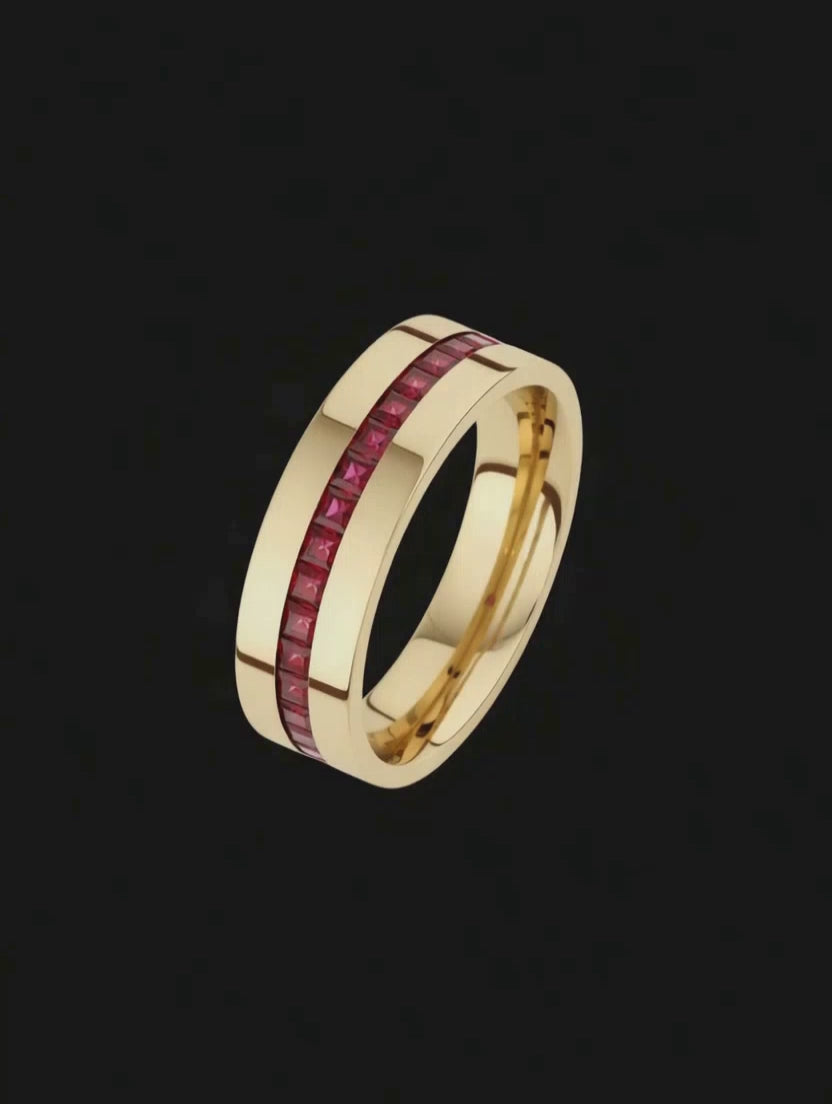 Meia aliança em ouro amarelo 18k. Anel meia aliança com rubis quadrados.