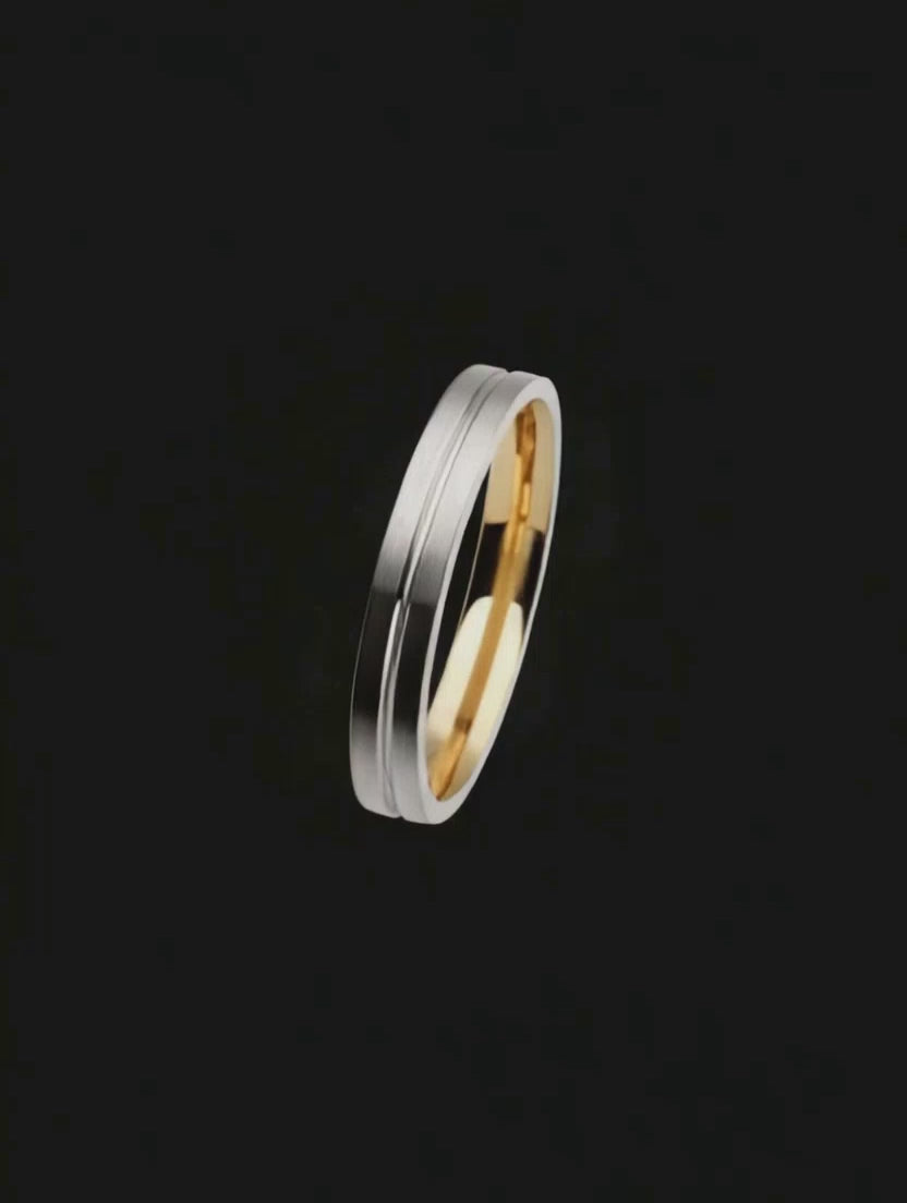 Aliança diferenciada em duas cores de ouro 18k, ouro branco no exterior e ouro amarelo no interior. Estrutura de aliança reta e acabamento externo fosco-acetinado e interno polido/brilho. Produto feito à mão.