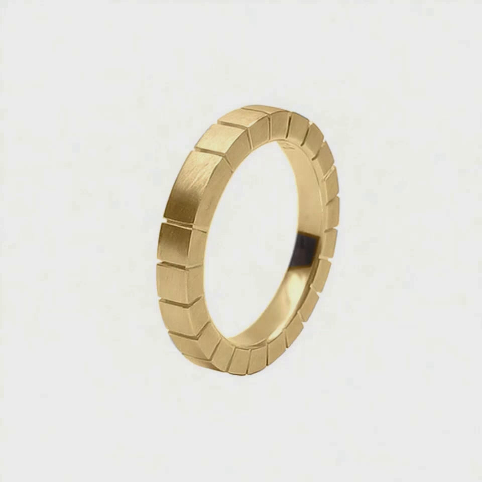 Anel de ouro amarelo 18k. Anel elegante com estrutura lateral alta, acabamento fosco acetinado e frisos. Produto feito à mão.