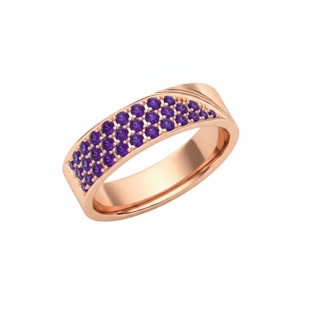 Anel largo especial e diferenciado ouro rosa 18k. Anel de ouro rosa, estrutura maciça, reta com detalhes em 3 frisos finos curvos e ametistas. Produto feito à mão.