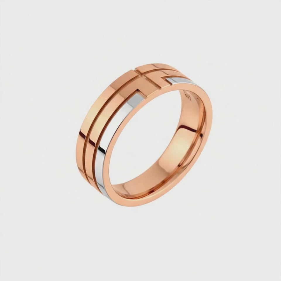 Anel largo em estrutura reta ouro rosa e branco 18k. Anel trabalhado com frisos paralelos e detalhe em ouro branco. Produto feito à mão.