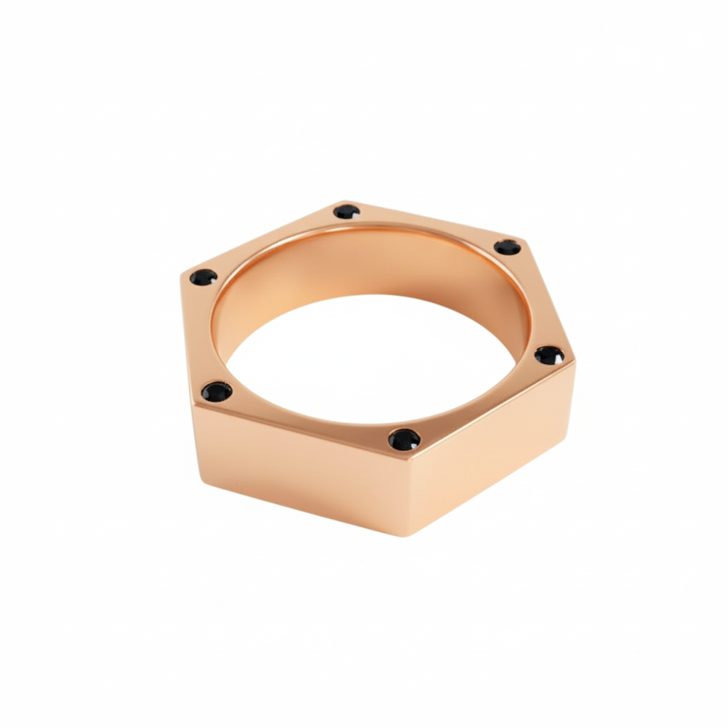 Anel hexágono de ouro rosa 18k. Anel versátil e moderno com 12 diamantes cravados nas laterais.