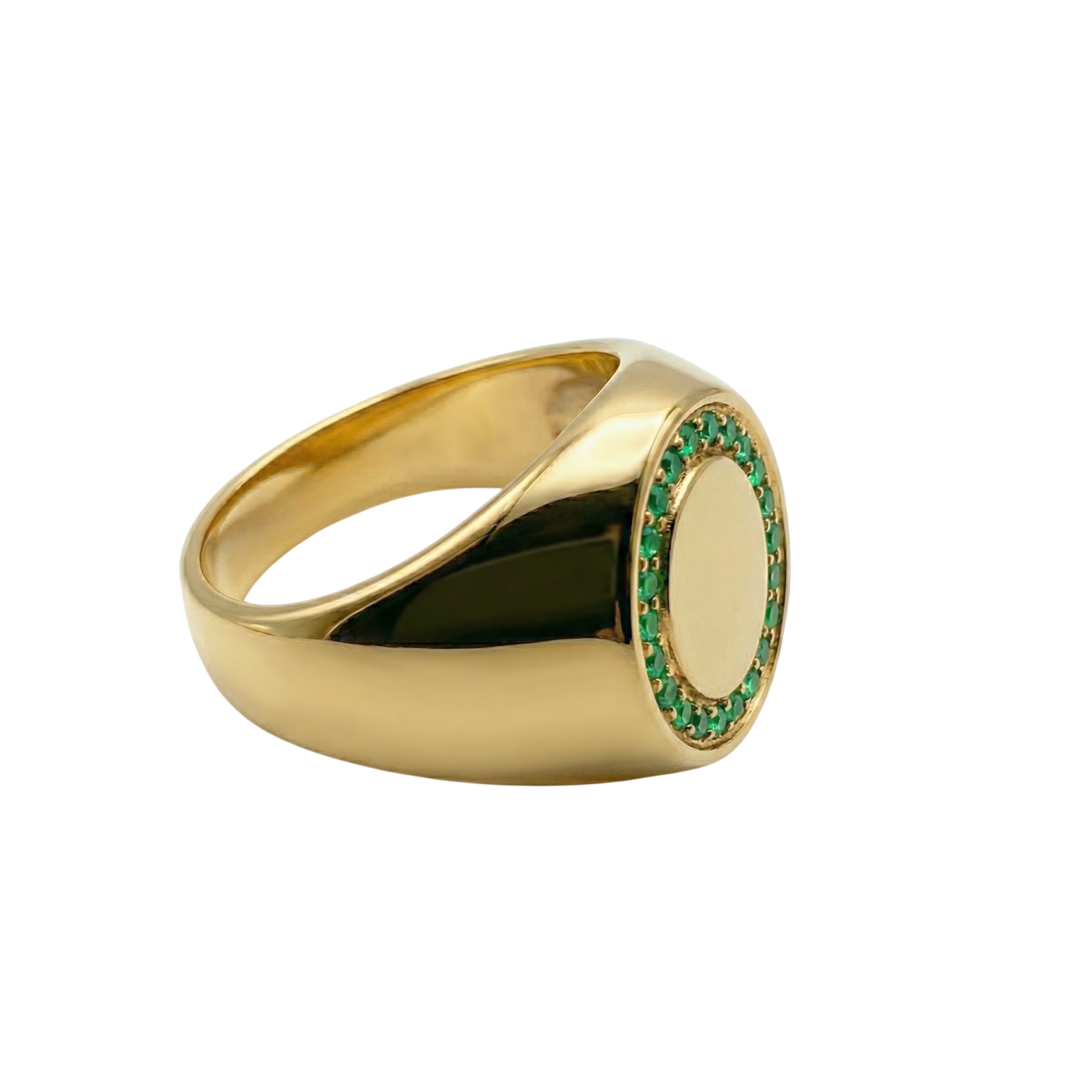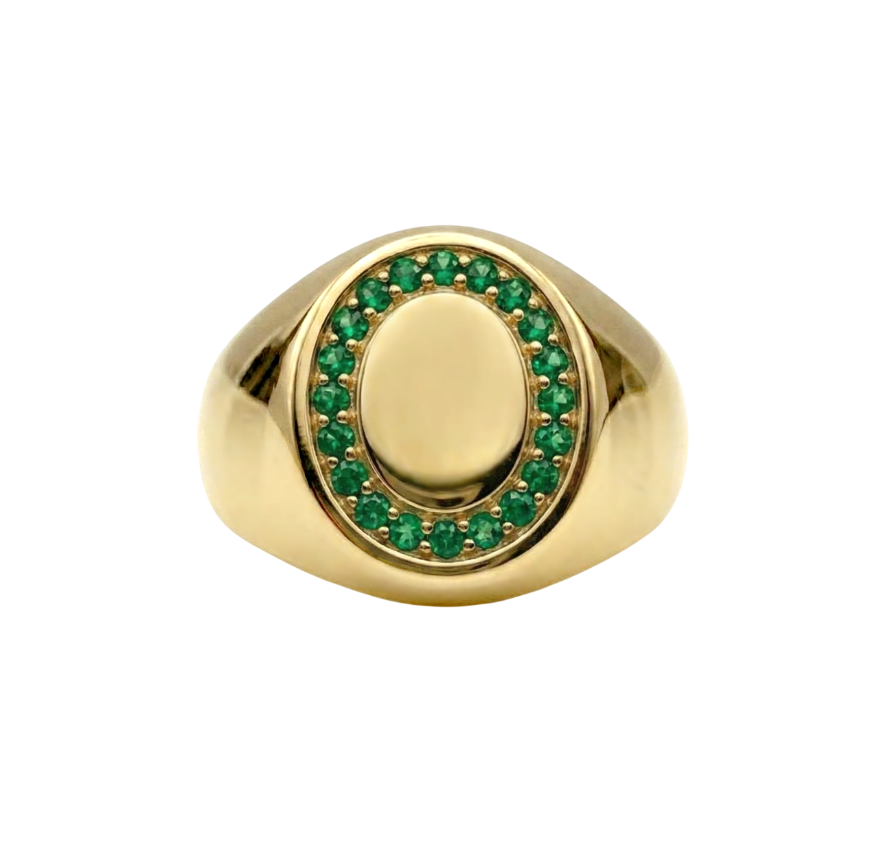 Anel oval em ouro amarelo 18k, com esmeraldas em cravação pavé. Anel masculino design exclusivo e de luxo, com esmeraldas.