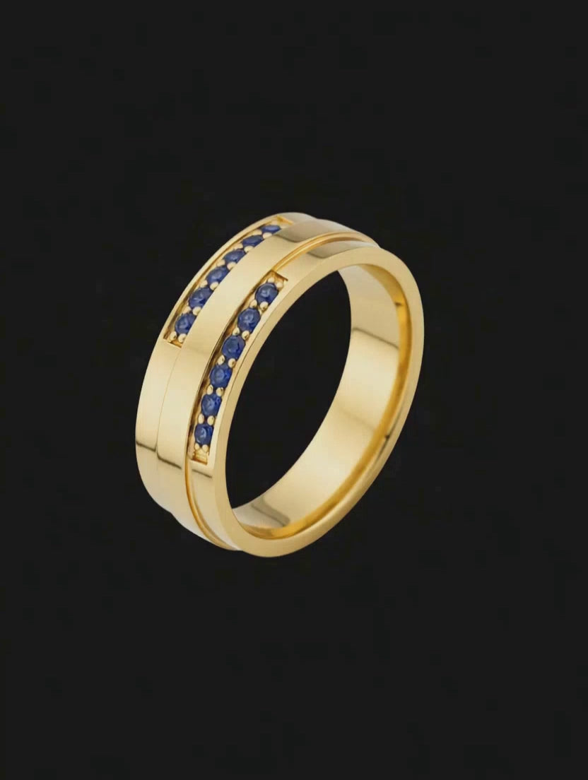 Anel ouro amarelo 18k, com safiras. Maravilhoso anel maciço de safiras com design exclusivo e diferenciado. Anel com linhas retas, estrutura central levemente em desnível e acabamento externo polido. Produto feito à mão.