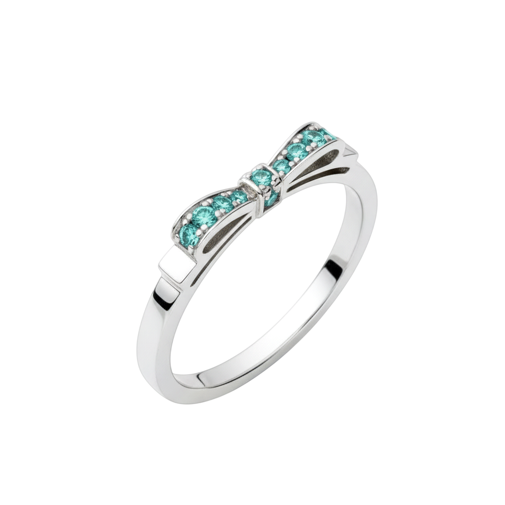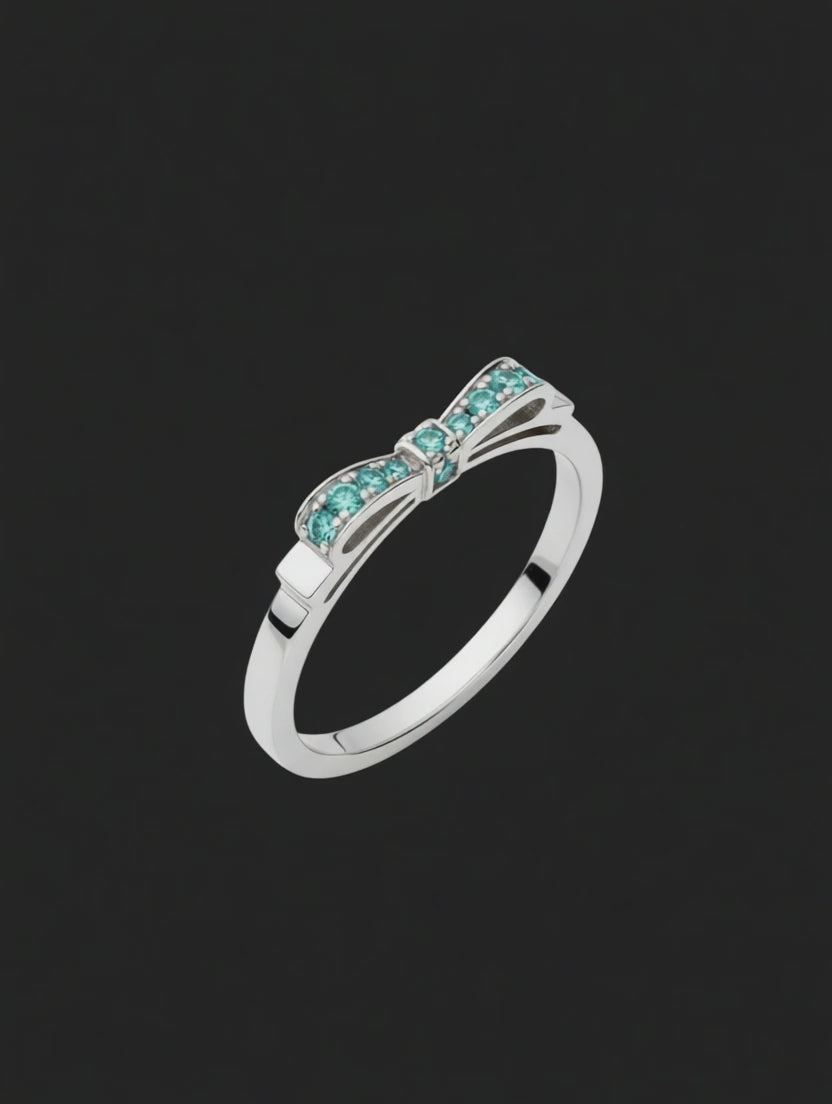 Anel em ouro branco 18k com design de laço cravejado de turmalinas paraibas, unindo delicadeza e sofisticação atemporal. Produto feito à mão.
