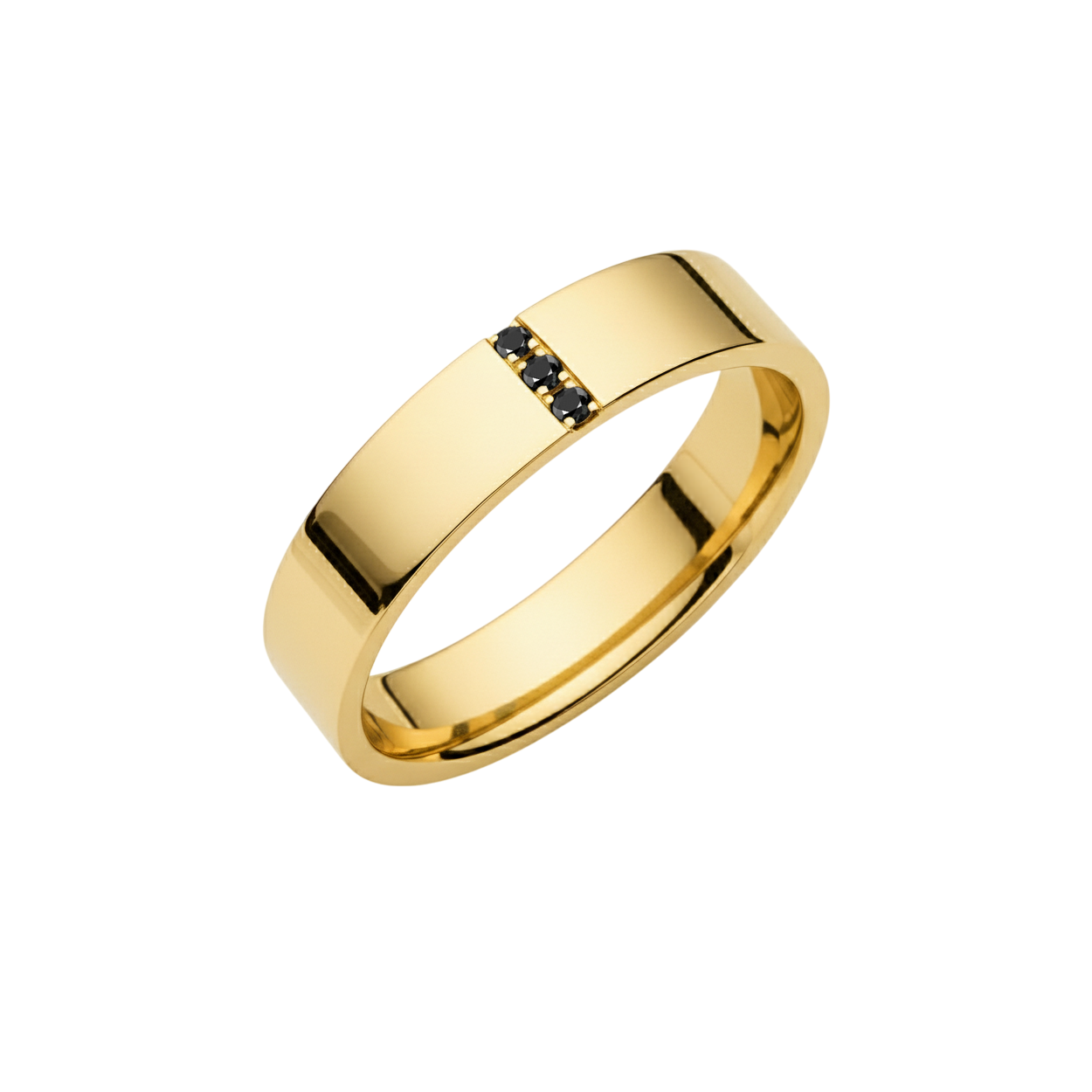 Anel masculino ouro amarelo 18k com detalhes de diamantes negros em cravação pavé.